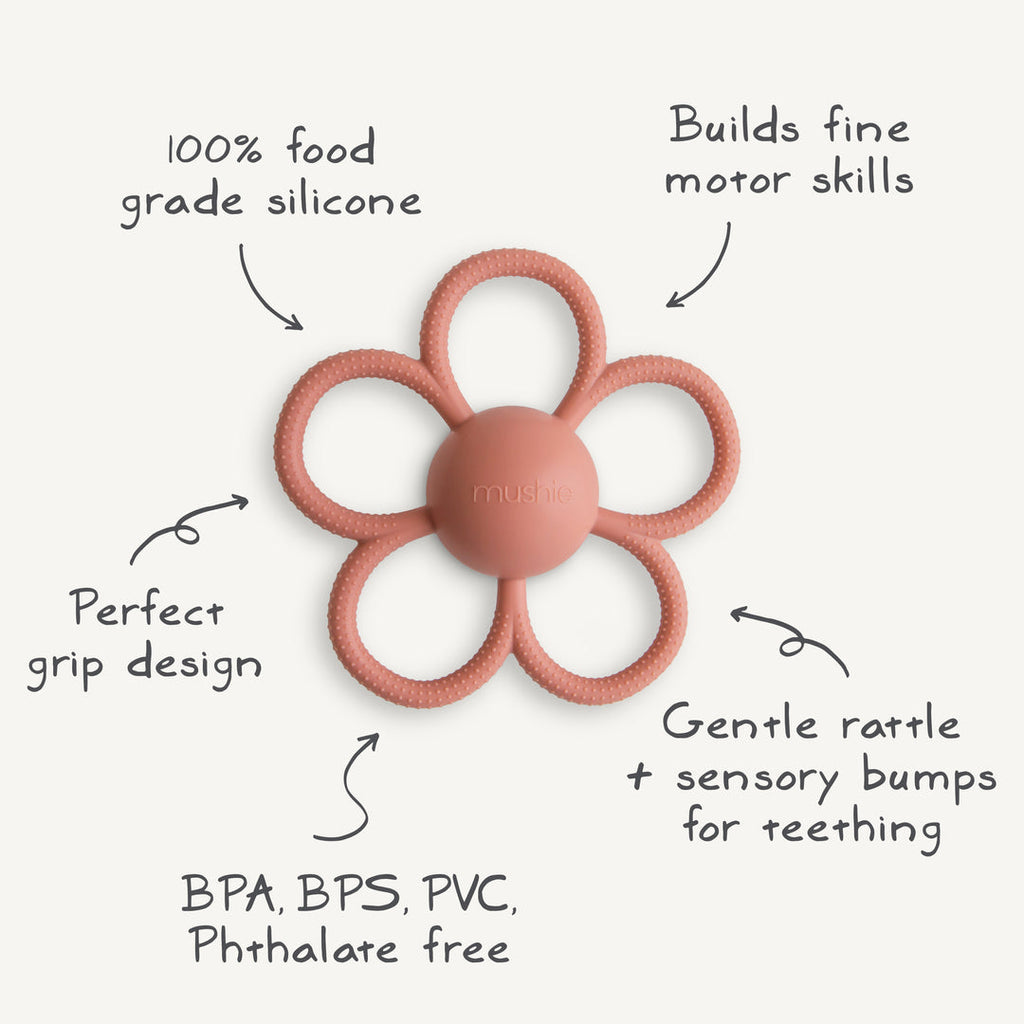 The Mushie Silicone Rattle Teether is designed with functionality and comfort in mind. The cheerful sound engages baby’s auditory senses for added soothing relief. With handles that are easy for small hands to grasp and a textured silicone surface that massages gums, these rattle teethers are perfect for your little one’s teething journey. Made from 100% non-toxic, BPA free, food-grade silicone.